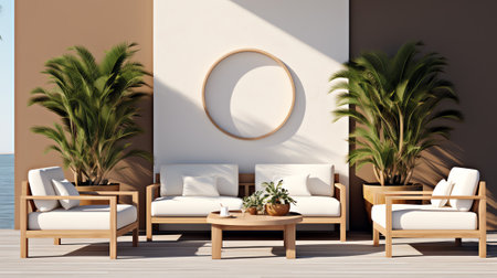 An AI generated illustration of outdoor living area with a ground-level couch and table