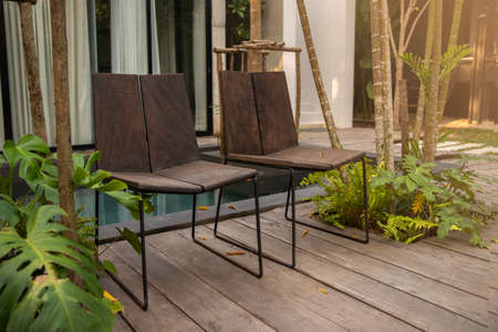Two chairs in garden . wooden garden furniture on wood floor outdoor for relaxing on summer days. Garden landscape with two chairs in nature, Backyard exterior