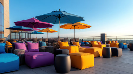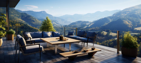 An outdoor lounge arrangement is presented, featuring a comfortable sofa set and a small coffee table. The scene is bathed in sunlight under a clear blue sky, offering an expansive ocean view. The setting hints at relaxation and leisure in a contemporary environment, suitable for various commercial or editorial applications.