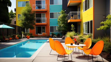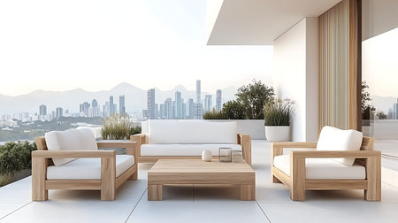 Contemporary outdoor seating area with modern furniture and ample space for text