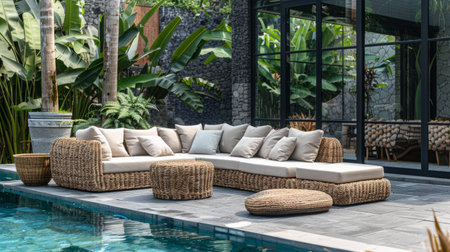 wicker sofa and low table placed near a swimming pool, generative ai