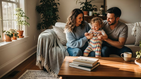 A family spends time with a toddler in a domestic setting. The image displays natural light, illuminating the scene. The composition features a sofa, a table, and indoor plants. This image could be used for various commercial and editorial projects.