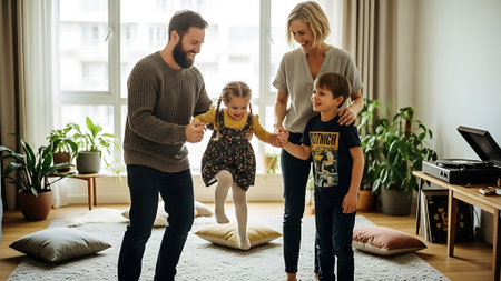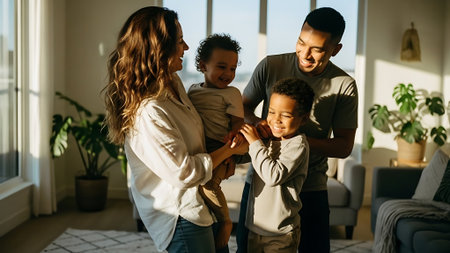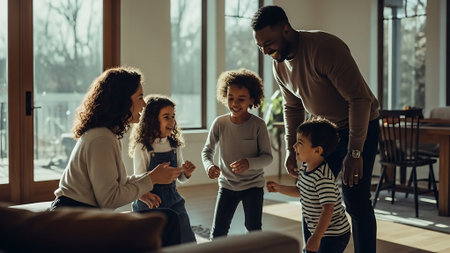 A happy family of four enjoying quality time together indoors