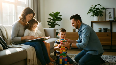 A happy family of four plays with colorful building blocks on a rug in their sunny living room. The parents and two young children share a moment of joy and bonding in a cozy home environment.