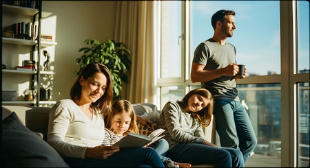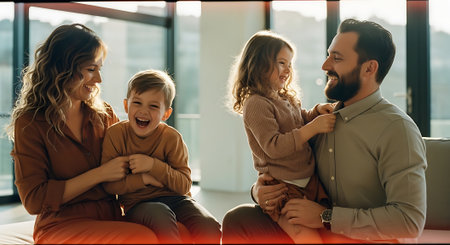A family of four sits together on a comfortable sofa in a warmly lit room. The composition includes the parents and their two young children. The scene features natural light, soft textures, and a cozy atmosphere. Suitable for illustrating family life, lifestyle, or commercial projects.