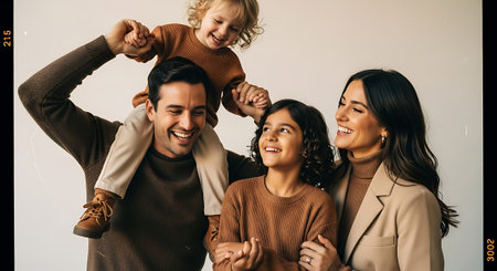 A joyful family of four, including parents and two children, posing together and smiling in warm, earth-toned sweaters against a plain background.