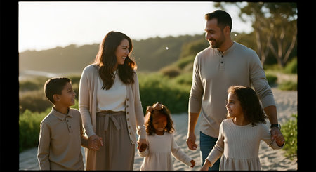 A joyful family of five walking hand-in-hand on a dirt path during sunset in a natural, scenic landscape.