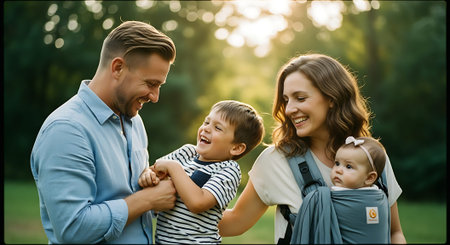 A smiling couple with their young son and baby daughter enjoying a sunny day in a park, embracing and laughing together.