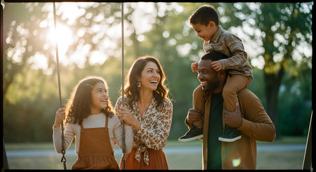 A joyful family with two children and parents at a park. The father holds the young boy on his shoulders while the mother and daughter smile on the swing.