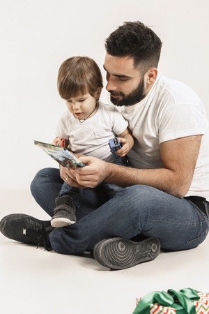 The happy family with kid sitting together and reading book isolated on white studio background