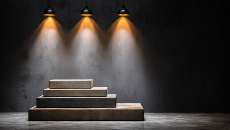 Three hanging lights illuminate a multi-tiered platform against a textured, dark wall
