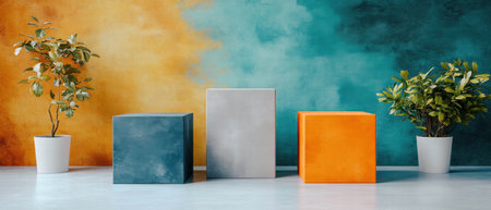 Bold color blocks create a vibrant and textured backdrop for modern decor