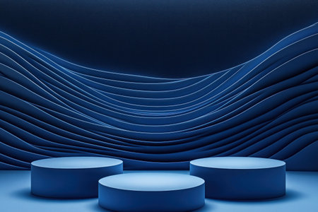 Abstract blue background with three podiums for product presentation, 3D rendering illustration, blue color scheme, minimalist style, high resolution, ultra-detailed, sharp focus, studio lighting, blue waves, blue and white color palette, blue and white podiums, blue background, blue waves, blue abstract design, blue and white color theme, blue abstract pattern, blue background, blue podiums, blue wave elements, blue background. --ar 3:2 --v 6.1 Job ID: d41388dc-e38d-4776-bff6-fd35f4215033