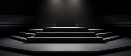 Sleek black podium in a minimalist theater, dramatic and focused,