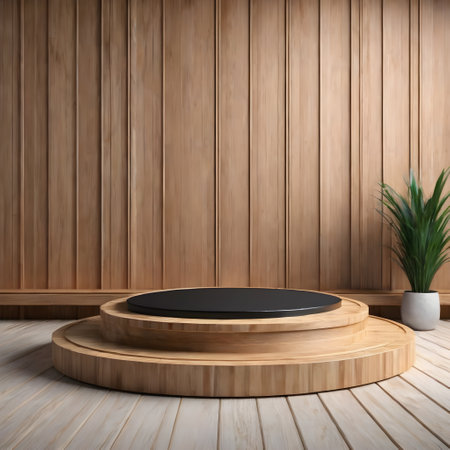 A beautifully designed wooden platform stands in a well-lit indoor area, complemented by a green potted plant nearby.