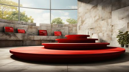 Minimal podiums on a red background.