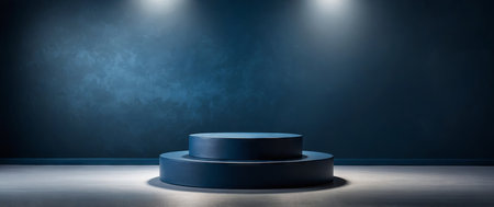 Blue dramatic lighting accentuates an empty podium, perfect for presenting products with a powerful visual impact.