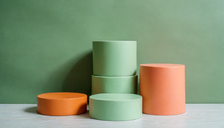 Set of green, orang, pink cylinder pedestal podium display, Empty room background. Abstract modern vector rendering 3d shape for products display presentation. Pastel minimal wall scene, Studio room.