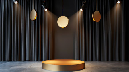 This image features an elegant stage with circular lights suspended above a spotlighted circular platform, surrounded by dark drapes, creating a dramatic atmosphere.