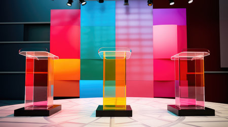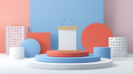 A clean podium stands ready on a stage surrounded by geometric pastel shapes for a business presentation in spring.
