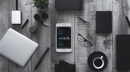 A stylish modern workspace featuring a smartphone displaying data charts, a laptop, coffee cup, glasses, and notebooks, perfect for business and creative professionals.