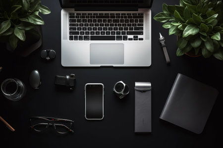 Monochromatic black office desk setup featuring a laptop, smartphone, notebooks, and a coffee mug, ideal for modern professionals.