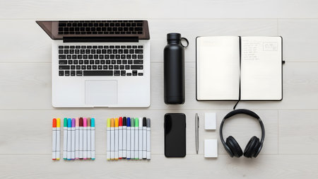 Overhead view of a modern workstation setup with laptop, notebook, and creative tools