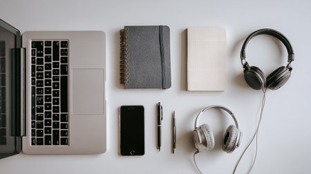 An organized workspace showcases a laptop, smartphone, and headphones. Additional elements include a planner, pen, coffee cup, and a small potted plant. The setting appears bright and modern with neutral colors. Suitable for illustrating technology, business, or lifestyle themes.