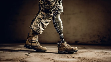 Soldier with a prosthetic leg in a military uniform and boots
