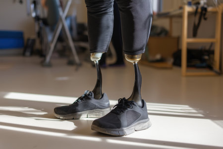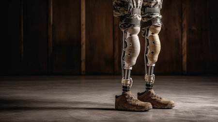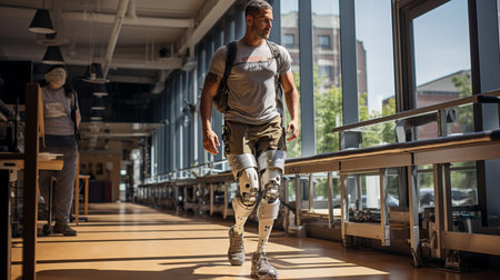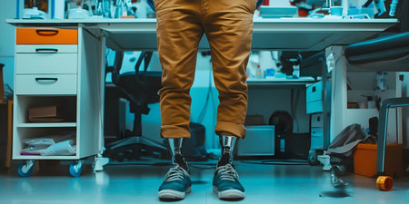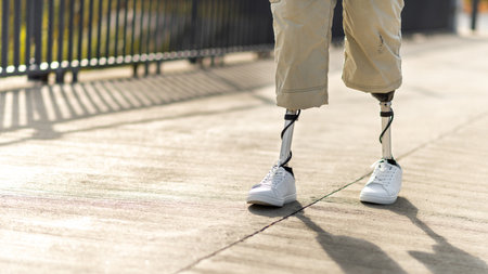 A unique image of a man with prosthetic legs, symbolizing the restoration of mobility and ergonomic support with modern medical technology.