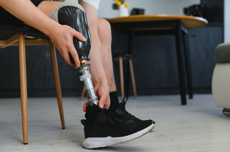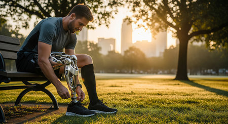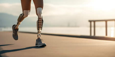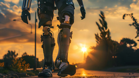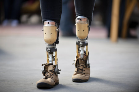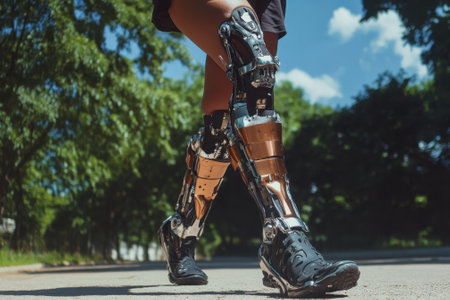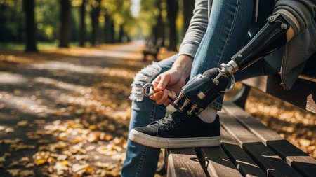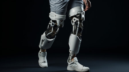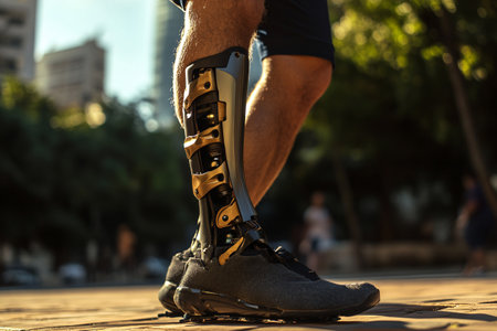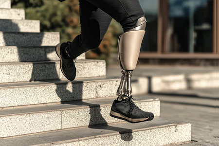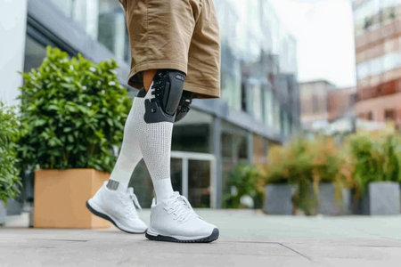 Delve into the future of disability solutions with this showcasing modern technology in a prosthetic leg, featuring a robotic artificial knee. Witness the intersection of innovation and empowerment for people with disabilities, highlighting advanced mobility solutions.