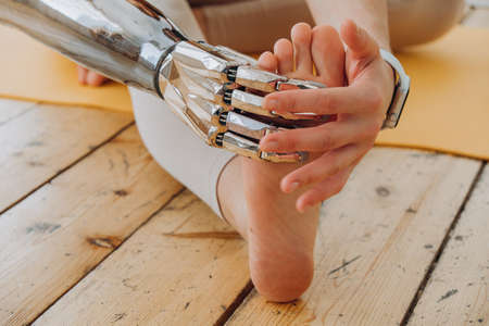 Close-up of young woman with prosthetic arm in sports clothing sitting on exercise mat and exercising