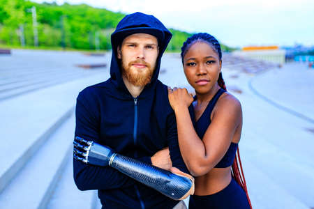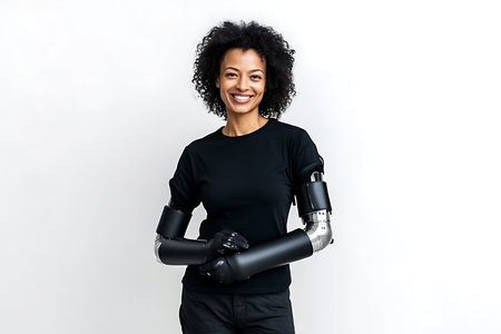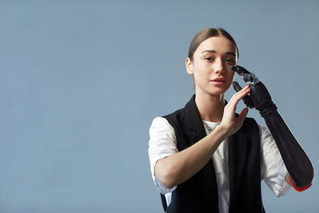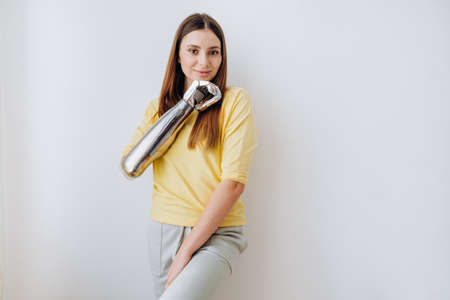 Attractive lady with bionic prosthesis arm looks into camera