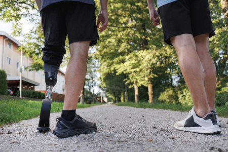 Two male friends are jogging on a trail surrounded by trees, one with disability using a prosthetic leg for support.