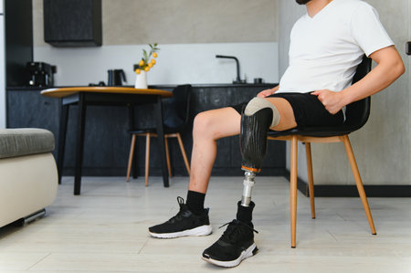 Closeup of unrecognizable man with bionic prosthetic leg at home indoors, copy space.