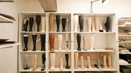 A welllit studio featuring a collection of various 3Dprinted prosthetics each uniquely tailored arranged neatly on shelves..