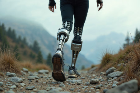 Prosthetic leg hiking. Person with prosthetic leg walking on mountain trail, showcasing determination and adaptive sports in nature.