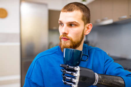 young freelance businessman with prosthesis hand working at home in laptop and drinking water or tea in the kitchen