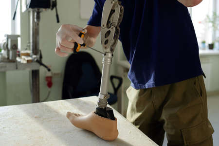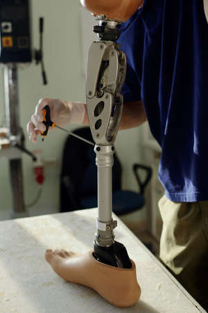 Close-up elevated view of a man adjusting the screws on an artificial prosthetic leg.