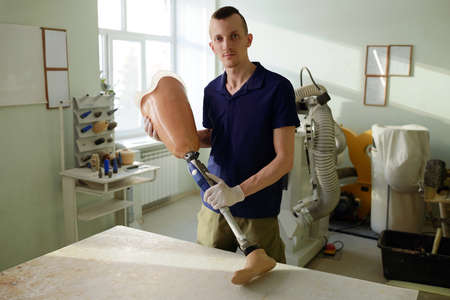 Young specialist of manufactory holding ready leg prosthesis consisting of prosthetic socket, metallic mechanism and foot