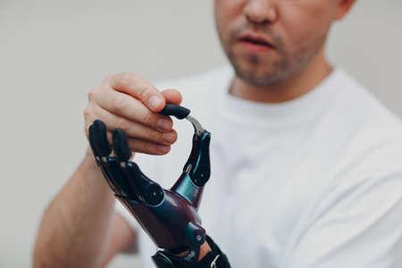 Young disabled man with artificial prosthetic hand put on finger nozzle pad