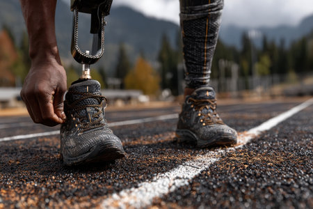 An athlete with a prosthetic leg is preparing to run on a track, focusing on adjusting their shoe. Mountains are visible in the background under a cloudy sky.
