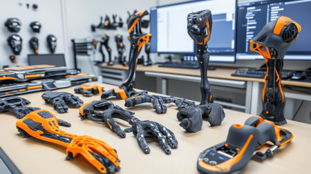 Prosthetic leg design and engineering workspace with tools in modern office. concept of biomedical innovation, precision engineering, assistive technology.