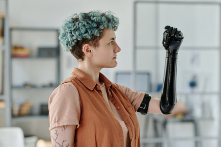 Side view portrait of young woman looking at cyber prosthetic arm and smiling