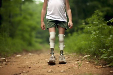 Child with prosthetic legs walking in the forest. Inclusive design, disability and accessibility. Young person with prostheses in nature. Empowering disability concept