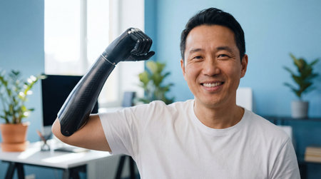 Man with advanced prosthetic arm smiling confidently in modern home office, showcasing empowerment, technology and positive lifestyle.