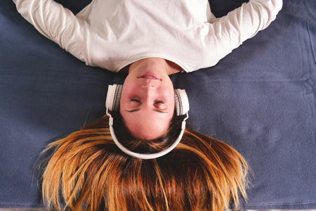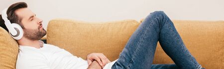 Young hipster in headphones listening to music, teenage boy lying at home on the couch enjoying music