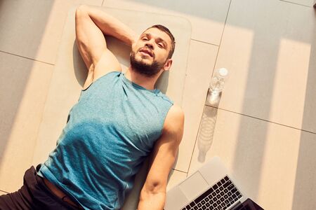Tired young male sitting with closed eyes on sofa with laptop standing near him