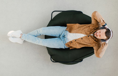 Guy Wearing Earphones Listening Music Lying In Chair Indoor