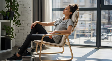 A young woman in sportswear rests in a modern chair with a towel around her neck and eyes closed. She appears relaxed and peaceful after a workout in a sunlit room.